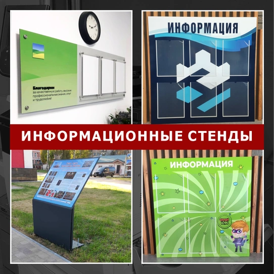 Задача информационного стенда — четко структурировать и оптимизировать подачу информации. Любой информационный стенд, вне зависимости от места его расположения и размещаемой на нем информации, является лицом организации, предприятия. Стенды, выполненные в фирменном корпоративном стиле организации (цветовое оформление поля стенда, размещение логотипов) визуально выделяются, привлекают внимание, подчеркивают солидность и надежность организации. Производство информационных стендов зачастую требует творческого подхода. Над созданием такой продукции в компании «Колорит» трудится группа дизайнеров, готовая создать эксклюзивные стенды, которые будут выполнять не только информационную, но и эстетическую функции.